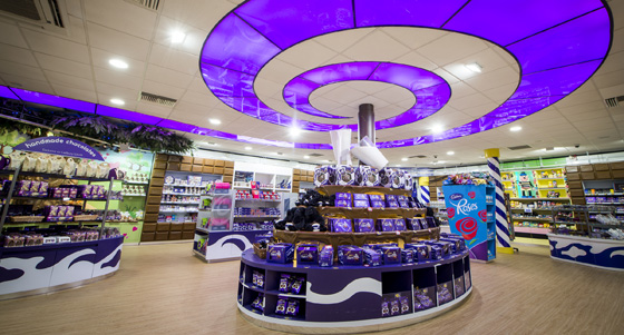 The new store is testament to this. It truly embodies the spirit and feel of the brand. It is a chocoholics paradise - a brand experience store, where you actually purchase (and eat) the product there and then. This out of town shop is beautifully branded, colour coordinated and exceedingly well designed. It’s big, bold and most importantly fun. All the store fixtures, fittings and displays are heavily themed in Cadbury colours and styles, and lead you through the store on your journey to the till, or tour beyond.