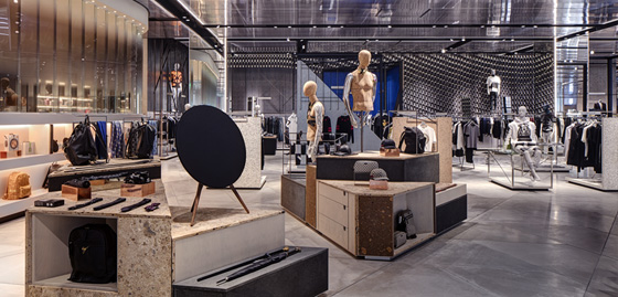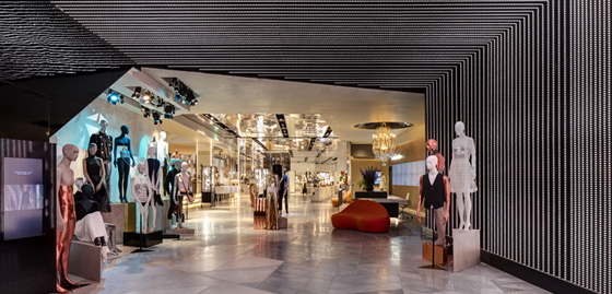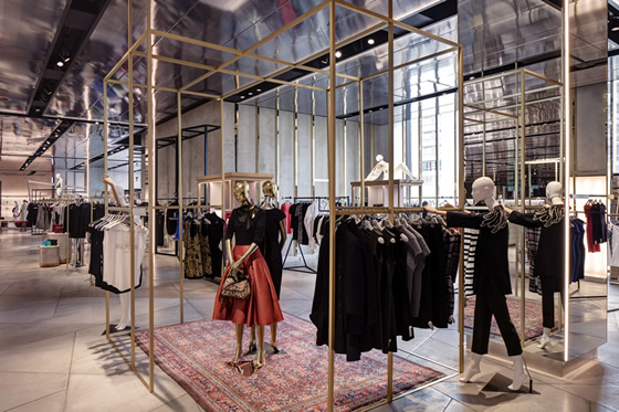 The shopfittings, fixtures, garment rails, shelving, props and accessories are all amazing, what more can I say and what else would you expect? As with the flooring, lighting and finishes, each style of shop fixture tells a new story, a different brand within the ultimate department store. Low level display plinths constructed from marble and wood, coupled with featureless mannequins, are used to display accessories and lead your eye into and around the store. Some large cage-like structures, crafted from flat, angular metal, reach high up into the double height ceiling within footwear. Other areas use eye level display tables covered in sheet steel with shiny copper bottoms, or wood based with flat sheet steel tops to counterbalance the extreme heights and to tell different brand stories. My favourite has to be the highly polished copper department in menswear: tubular uprights support large, shallow, equally shiny copper trays and display folded merchandise. Whilst in women’s wear, thick, tubular brass garment rails appear to be tied in position with unlimited copper wire. A very crude construction similar to that used by the Scouts, is thoroughly ‘glammed up’ here with polished brass uprights topped with wood, together with seriously shiny copper wire. This store knows no bounds.