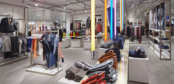 Each different level has its own distinct appearance, but is part of a greater overall ‘look’ featuring pop up cubes, pavilions and its ‘nine box grid’ system. Fixtures and fittings are kept simple and central display features instruct and inform customers of new products and inspirational ideas. Bleached, wood effect flooring and white tiled ceilings with strips of spotlights on tracks and countersunk, create a neutral backdrop for the ‘Kaleidoscope’ theme to be set ablaze. Each department is differentiated with its own palette of colour, texture and graphics. In womenswear, display units, shelving and sofas are predominantly white allowing the main attraction (as well as the clothes) to really stand out. A multitude of strip lights in a kaleidoscope of colours hang vertically from the ceiling throughout the department and create a striking background for the display features and mannequins. In menswear the overall tone is richer and darker. Similar display units are mostly grey with a mixture of beech and antique shelving and display tables. Quirky props and accessories add impact to this retro section, such as upturned cable bobbins and wire mesh crates. Formal wear has a more upmarket ambience enhanced by mirrored screens together with busts on plinths.