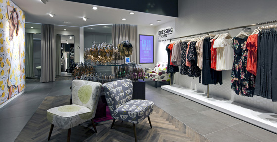 Taking inspiration from the earlier Argyll Street flagship, Oasis has also opened its doors at the new Westfield Stratford City. Dalziel and Pow has successfully combined the innovative look and feel of its two storey West End counterpart, within this single floor mall store. The new outlet features mood enhancing lighting plus treatments to fulfil its latest day and night theme and add a touch of class. As you enter this latest creation, you are immediately aware of a shift in style. The dark wooden panelled entrance stretching from floor to ceiling and allowing just a glimpse of what the store has to offer, is impressive to say the least and appears to elevate this main stream store to new heights. Great emphasis has also been placed on the window display. On visiting, the theme of the moment was fifties florals and Oasis was keen to flaunt its partnership with a specialist textile manufacturer. In very Harvey Nic’s fashion, the entire window had been taken over by an enormous stack of life size mattresses, each covered in an exquisite floral print, with the title ‘The Print – cess and the pea’. And, yes, there was a tiny pea popping out from the makeshift bed.