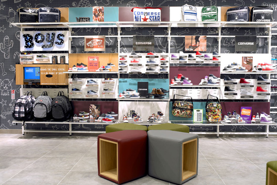 The concept is simple, engaging (especially if you’re a small person) and utterly accessible. An invigorating colour palette and quirky hand drawings that will appeal to kids the world over have been applied throughout the store. The double height, glass front complete with doodles is simply stunning. Whilst internally, differing styles and heights of wall units mix casually with a variety of freestanding display fixtures and fittings and are kept purposely low to aid the younger shopper. Divided into three key sections, boys, girls and ‘little ones’; each area has a distinct appearance to help direct the correct customers to the relevant shoes. The boys are on the left. A practical, fully adaptable white wall unit displays shoes and bags on a range of small individual and large glass shelves and hooks. The unit is set against a striking graffiti wall – white hand drawn monsters, cars, skulls and amphibians are sketched onto grey graph paper - to designate the boys’ zone. The girls, on the right, have a similarly eye catching background that has also clearly taken its inspiration from the school exercise book. Hearts, swirls, twirls and all things girly are doodled in white on a more fresh and feminine green wall. They create the perfect backdrop for the slightly more sophisticated perimeter ‘wardrobe style’ showcase that displays product in the girls’ zone. Finally, on the back wall, Little Ones is emblazoned in blue neon and items are displayed on individual shelves within a wood edged perimeter cabinet similar to the girls’. Further white, hand drawn pictures are set off against black on a striking panel at the bottom of the unit.