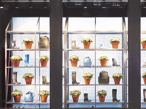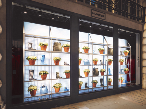 A colourful, traditional pop of spring for the Hunter store was created by Propability with an outdoor greenhouse inspired structure used to show off the spring season footware collection.