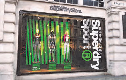 To launch their new ‘Sports Apparel’ range, Superdry teamed up with Stylo to create their September windows. Consisting of green vinyl battens interspersed with LED lights the scheme also features the brands new ‘Superdry Sport’ logo. Produced by Stylo, the scheme can be found at Superdry’s UK store on Regents Street as well as in stores across Europe and in New York’s Times Square.