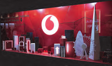Vodafone’s latest window features some of London’s most famous landmarks. The display features a multifaceted back wall with a giant illuminated Vodafone logo.